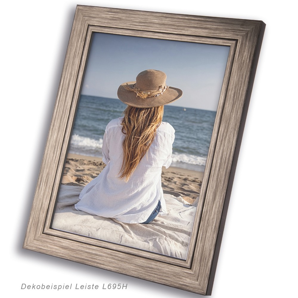Ausstattung: Alle Rahmen enthalten eine MDF-Rückwand (sofern nicht als Leerrahmen bestellt) und die bei der Bestellung ausgewählte Glasart. Die Ausstattung mit Einzel- und ggf. auch Doppelpassepartout ist ohne Aufpreis möglich. Als Passepartoutfarbe wird dabei verwendet: Mineralweiss (6001). Wenn Sie andere Passepartoutfarben oder -ausschnitte wünschen, bestellen Sie bitte ein Passepartout als Maßanfertigung separat dazu. Dieses ist dann allerdings nicht im Preis enthalten. Aufhänger & Aufsteller: Es sind Aufhänger für Hoch- und Querformat vorhanden. Bis zum Format 20×28 liefern wir unseren Drahtbügelaufsteller mit. Dieser wird einfach in die dafür vorgesehenen Bohrungen in der Rahmenleiste gesteckt. Der Rahmen steht damit stabil unabhängig von der Leistenbreite. Die Bohrungen für den Aufsteller sind im Hoch- und Querformat vorhanden.
