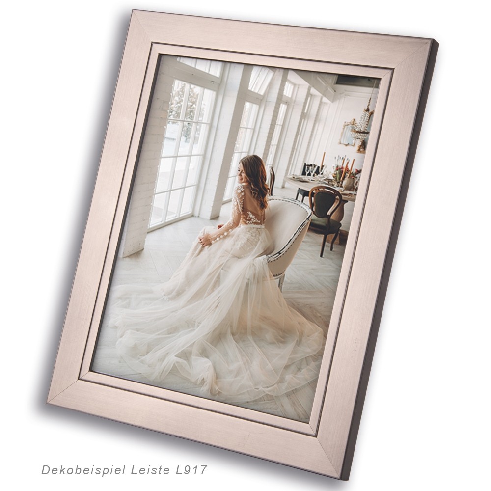 Ausstattung: Alle Rahmen enthalten eine MDF-Rückwand (sofern nicht als Leerrahmen bestellt) und die bei der Bestellung ausgewählte Glasart. Die Ausstattung mit Einzel- und ggf. auch Doppelpassepartout ist möglich. Als Standard-Passepartoutfarben werden dabei verwendet: Altweiss (6002) / Platin (W791). Wenn Sie andere Passepartoutfarben oder -ausschnitte wünschen, bestellen Sie bitte ein Passepartout als Maßanfertigung separat dazu. Aufhänger & Aufsteller: Es sind Aufhänger für Hoch- und Querformat vorhanden. Bis zum Format 20×28 liefern wir unseren Drahtbügelaufsteller mit. Dieser wird einfach in die dafür vorgesehenen Bohrungen in der Rahmenleiste gesteckt. Der Rahmen steht damit stabil unabhängig von der Leistenbreite. Die Bohrungen für den Aufsteller sind im Hoch- und Querformat vorhanden.