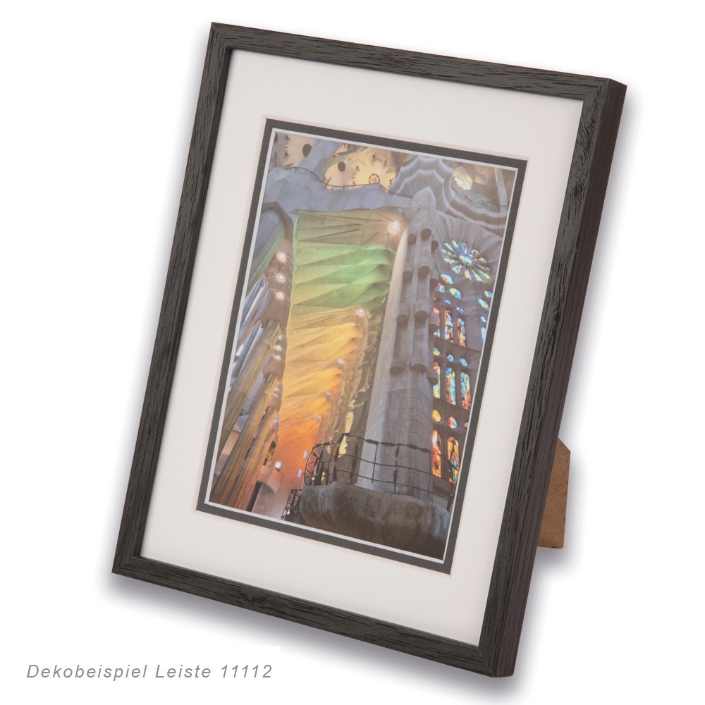 Die Bilderrahmen werden mit MDF-Rückwand (falls nicht anders bestellt) und der gewählten Glasart ausgestattet. Passepartouts können als Einzel- oder ggf. Doppelpassepartout gegen Aufpreis mitbestellt werden. Andere Passepartoutausschnitte und andere Farben sind separat als Passepartout-Maßanfertigung bestellbar. Der Rahmen enthält Aufhänger, mit denen er im Hoch- und Querformat aufgehängt werden kann. Zusätzlich wird bis zum Format 20×28 ein Drahtbügelaufsteller beigefügt. Dieser ist nur in die dafür vorgesehenen Bohrlöcher an der Rückseite des Rahmen zu stecken. Damit steht der Rahmen stabil sowohl hochkant als auch quer.