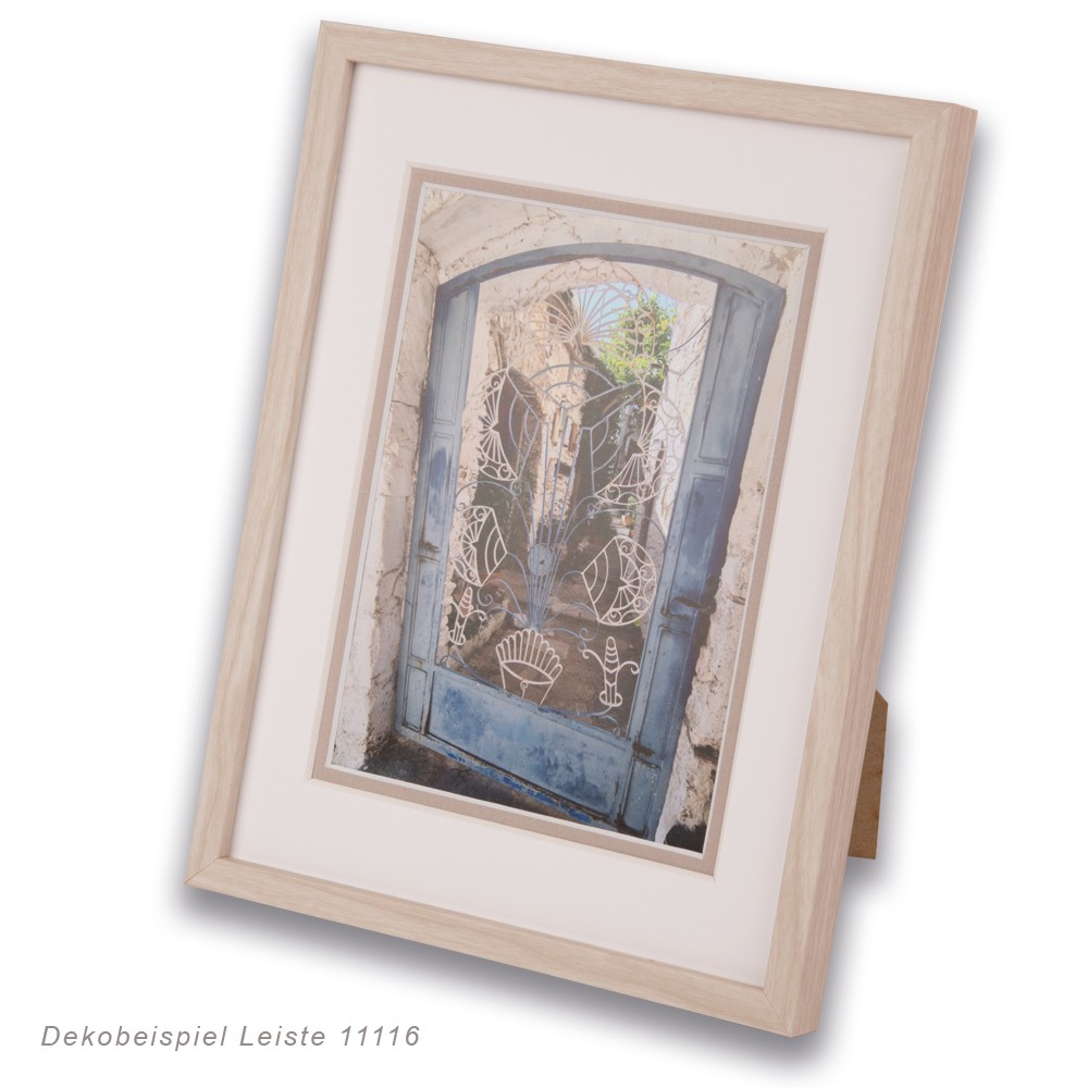 Die Bilderrahmen werden mit MDF-Rückwand (falls nicht anders bestellt) und der gewählten Glasart ausgestattet. Passepartouts können als Einzel- oder ggf. Doppelpassepartout gegen Aufpreis mitbestellt werden. Andere Passepartoutausschnitte und andere Farben sind separat als Passepartout-Maßanfertigung bestellbar. Der Rahmen enthält Aufhänger, mit denen er im Hoch- und Querformat aufgehängt werden kann. Zusätzlich wird bis zum Format 20×28 ein Drahtbügelaufsteller beigefügt. Dieser ist nur in die dafür vorgesehenen Bohrlöcher an der Rückseite des Rahmen zu stecken. Damit steht der Rahmen stabil sowohl hochkant als auch quer.