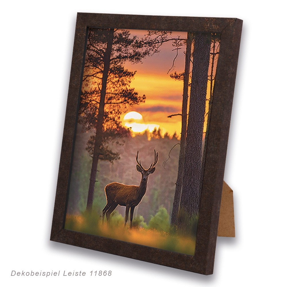 Die Bilderrahmen werden mit MDF-Rückwand (falls nicht anders bestellt) und der gewählten Glasart ausgestattet. Passepartouts können als Einzel- oder ggf. Doppelpassepartout gegen Aufpreis mitbestellt werden. Die Standard-Passepartoutfarben sind: Mineralweiss (6001) / Schokobraun (6400). Andere Passepartoutausschnitte und andere Farben sind separat als Passepartout-Maßanfertigung bestellbar. Der Rahmen enthält Aufhänger, mit denen er im Hoch- und Querformat aufgehängt werden kann. Zusätzlich wird bis zum Format 20×28 ein Drahtbügelaufsteller beigefügt. Dieser ist nur in die dafür vorgesehenen Bohrlöcher an der Rückseite des Rahmen zu stecken. Damit steht der Rahmen stabil sowohl hochkant als auch quer.