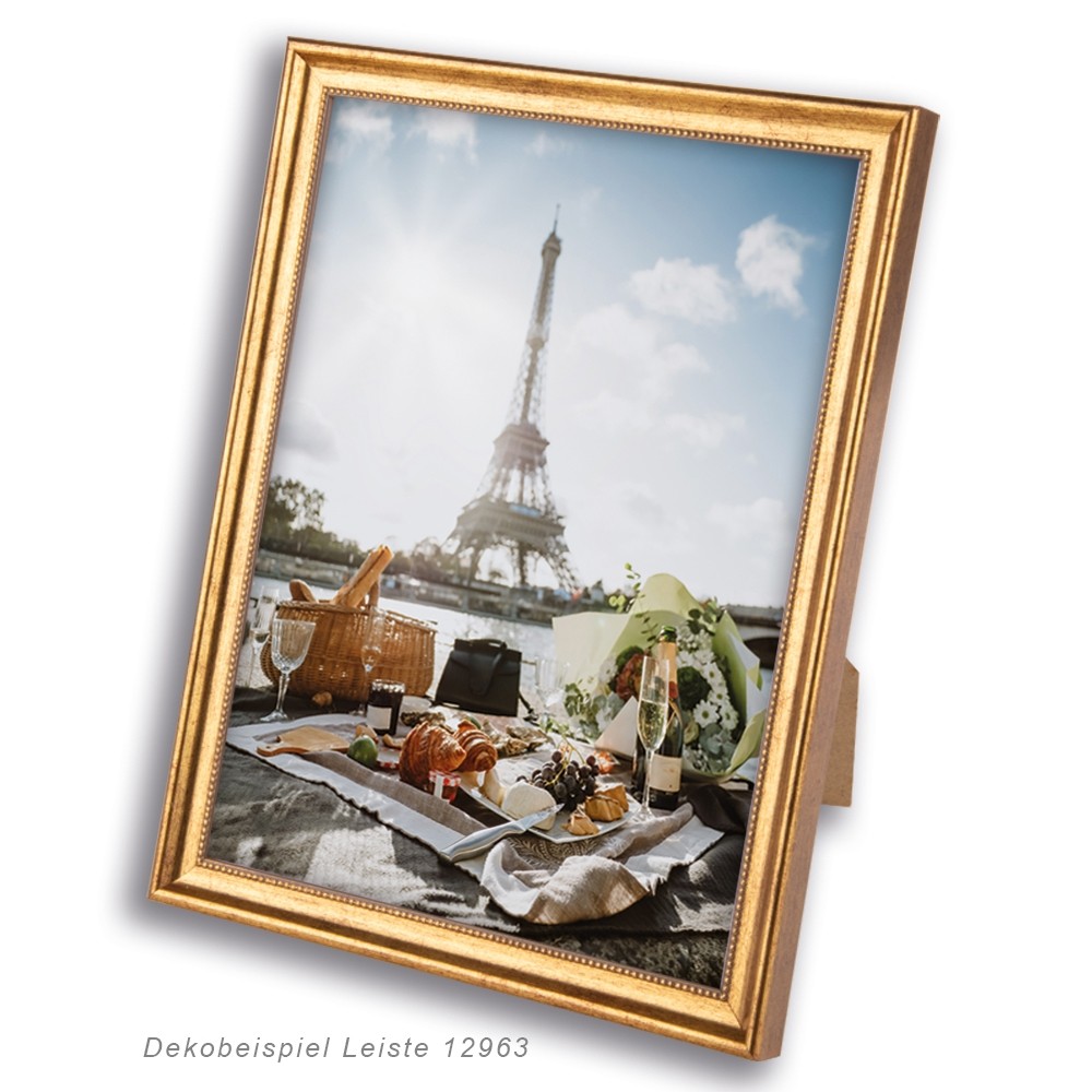 Die Bilderrahmen werden mit MDF-Rückwand (falls nicht anders bestellt) und der gewählten Glasart ausgestattet. Passepartouts können als Einzel- oder ggf. Doppelpassepartout gegen Aufpreis mitbestellt werden. Die Standard-Passepartoutfarbe ist: Mineralweiss (6001). Andere Passepartoutausschnitte und andere Farben sind separat als Passepartout-Maßanfertigung bestellbar. Der Rahmen enthält Aufhänger, mit denen er im Hoch- und Querformat aufgehängt werden kann. Zusätzlich wird bis zum Format 20×28 ein Drahtbügelaufsteller beigefügt. Dieser ist nur in die dafür vorgesehenen Bohrlöcher an der Rückseite des Rahmen zu stecken. Damit steht der Rahmen stabil sowohl hochkant als auch quer.