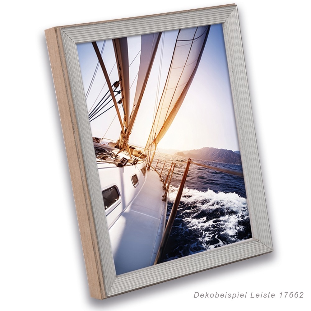Die Bilderrahmen werden mit MDF-Rückwand (falls nicht anders bestellt) und der gewählten Glasart ausgestattet. Passepartouts können als Einzel- oder ggf. Doppelpassepartout gegen Aufpreis mitbestellt werden. Die Standard-Passepartoutfarben sind: Mineralweiss (6001) / Clay (W567). Andere Passepartoutausschnitte und andere Farben sind separat als Passepartout-Maßanfertigung bestellbar. Der Rahmen enthält Aufhänger, mit denen er im Hoch- und Querformat aufgehängt werden kann. Zusätzlich wird bis zum Format 20×28 ein Drahtbügelaufsteller beigefügt. Dieser ist nur in die dafür vorgesehenen Bohrlöcher an der Rückseite des Rahmen zu stecken. Damit steht der Rahmen stabil sowohl hochkant als auch quer.