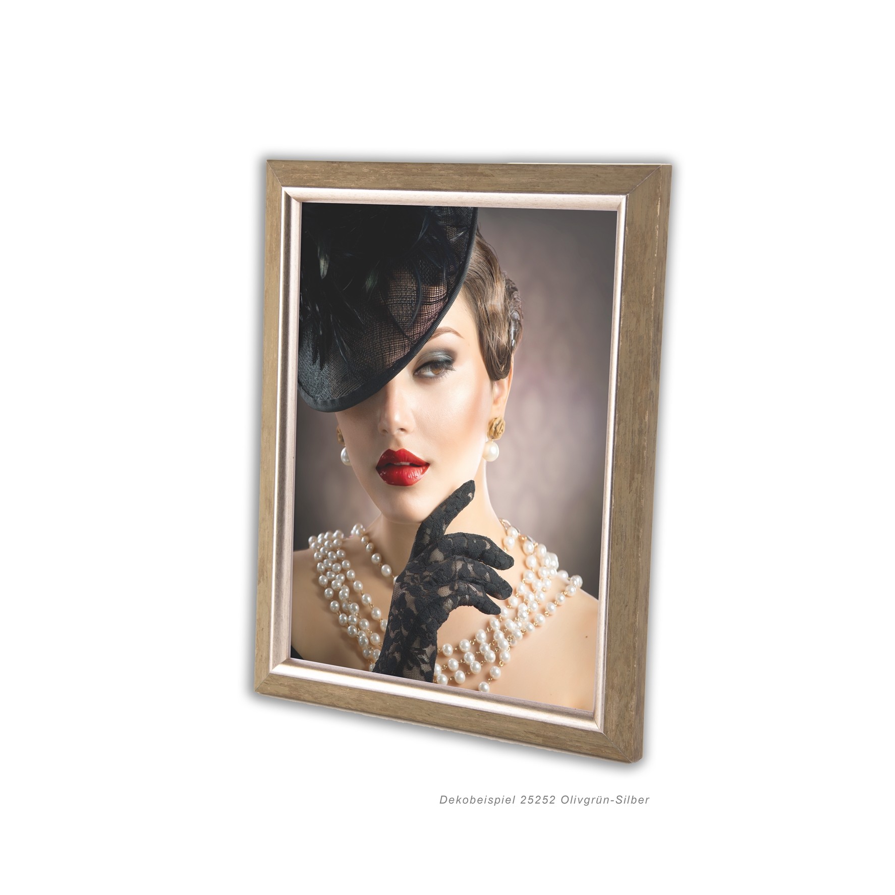 Die Bilderrahmen werden mit MDF-Rückwand (falls nicht anders bestellt) und der gewählten Glasart ausgestattet. Passepartouts können als Einzel- oder ggf. Doppelpassepartout gegen Aufpreis mitbestellt werden. Die Standard-Passepartoutfarbe ist: Mineralweiss (6001). Andere Passepartoutausschnitte und andere Farben sind separat als Passepartout-Maßanfertigung bestellbar. Der Rahmen enthält Aufhänger, mit denen er im Hoch- und Querformat aufgehängt werden kann. Zusätzlich wird bis zum Format 20×28 ein Drahtbügelaufsteller beigefügt. Dieser ist nur in die dafür vorgesehenen Bohrlöcher an der Rückseite des Rahmen zu stecken. Damit steht der Rahmen stabil sowohl hochkant als auch quer.