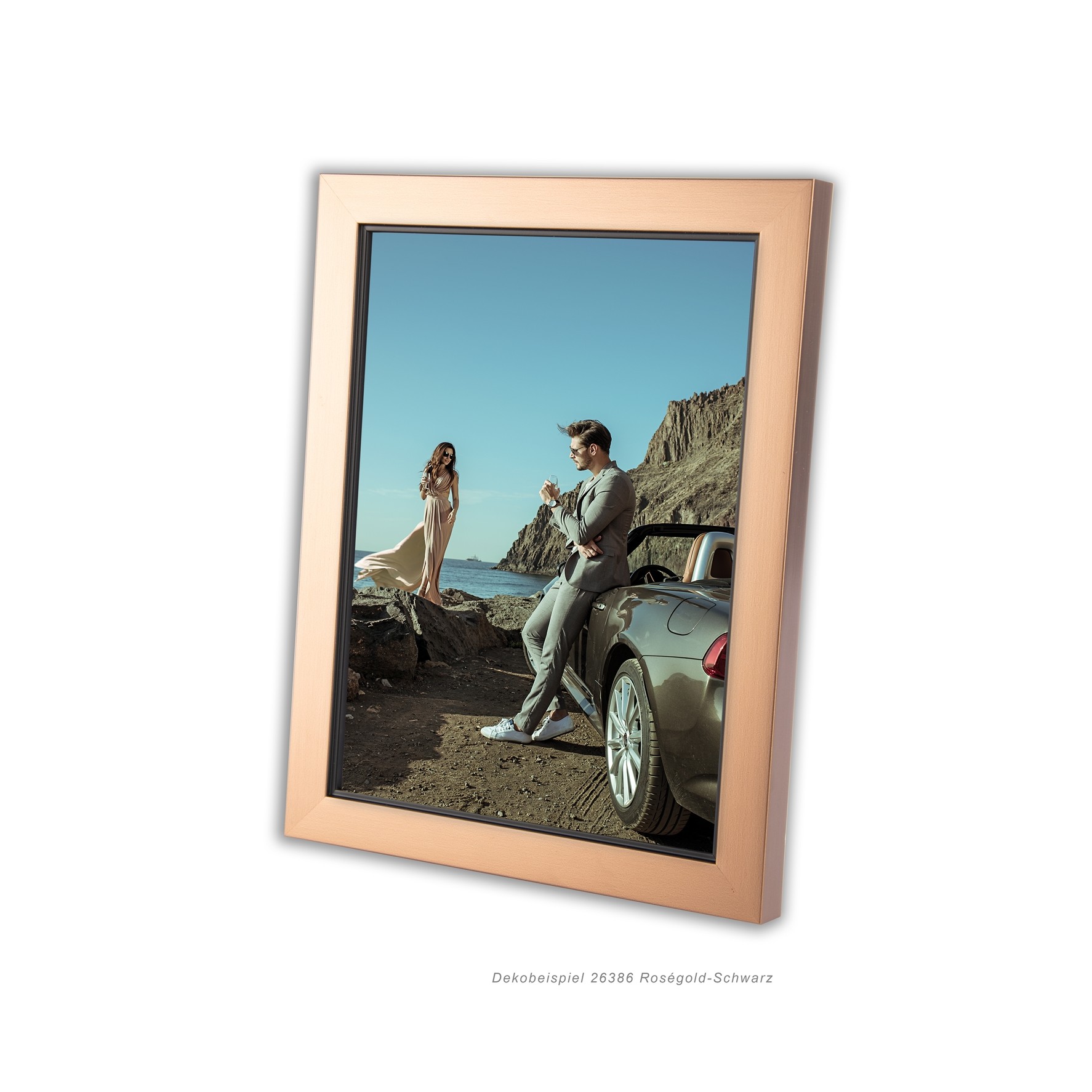 Die Bilderrahmen werden mit MDF-Rückwand (falls nicht anders bestellt) und der gewählten Glasart ausgestattet. Passepartouts können als Einzel- oder ggf. Doppelpassepartout gegen Aufpreis mitbestellt werden. Die Standard-Passepartoutfarbe ist: Mineralweiss (6001). Andere Passepartoutausschnitte und andere Farben sind separat als Passepartout-Maßanfertigung bestellbar. Der Rahmen enthält Aufhänger, mit denen er im Hoch- und Querformat aufgehängt werden kann. Zusätzlich wird bis zum Format 20×28 ein Drahtbügelaufsteller beigefügt. Dieser ist nur in die dafür vorgesehenen Bohrlöcher an der Rückseite des Rahmen zu stecken. Damit steht der Rahmen stabil sowohl hochkant als auch quer.