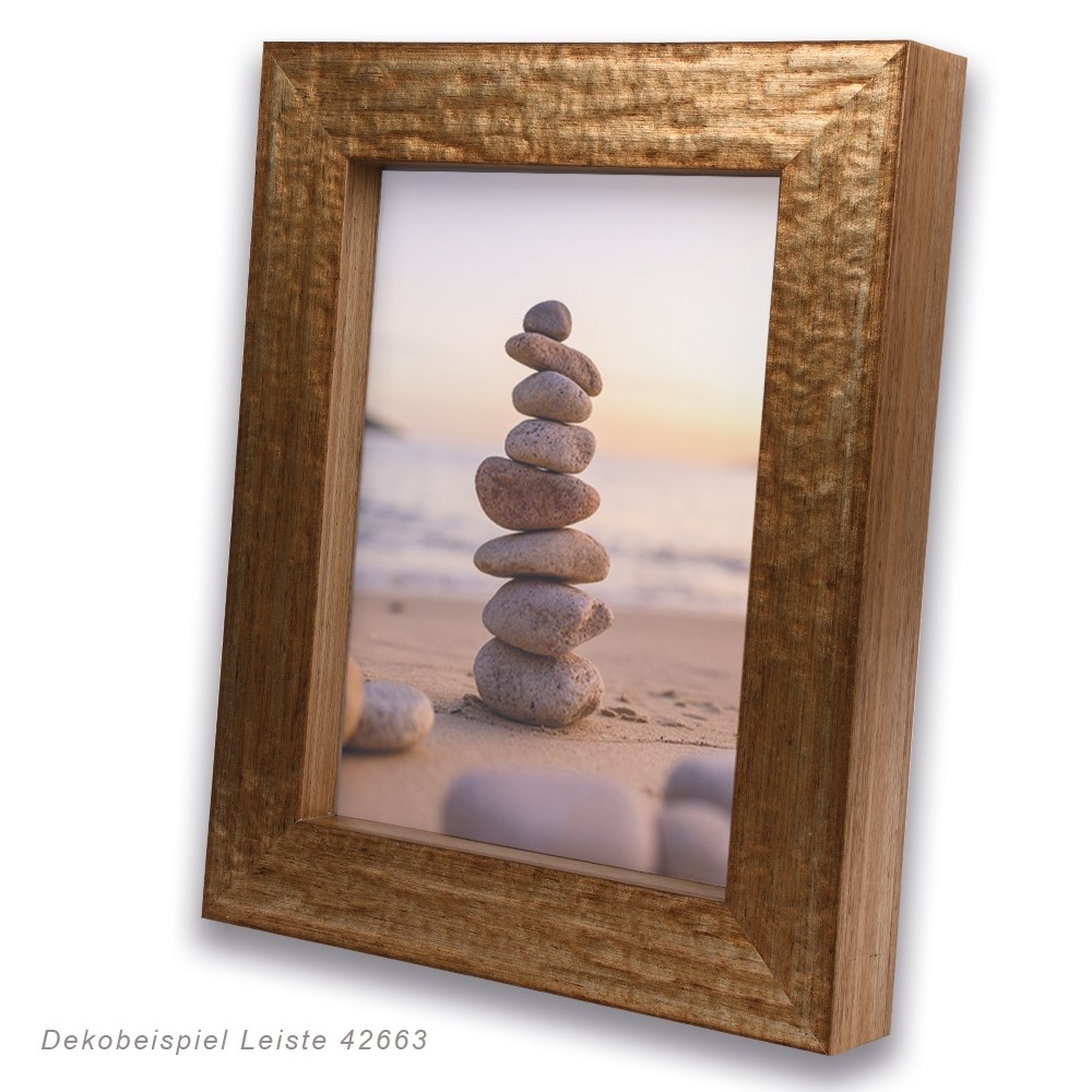 Die Bilderrahmen werden mit MDF-Rückwand (falls nicht anders bestellt) und der gewählten Glasart ausgestattet. Passepartouts können als Einzel- oder ggf. Doppelpassepartout gegen Aufpreis mitbestellt werden. Die Standard-Passepartoutfarbe ist: Kurator Naturweiss (KNW6425). Andere Passepartoutausschnitte und andere Farben sind separat als Passepartout-Maßanfertigung bestellbar. Der Rahmen enthält Aufhänger, mit denen er im Hoch- und Querformat aufgehängt werden kann. Zusätzlich wird bis zum Format 20×28 ein Drahtbügelaufsteller beigefügt. Dieser ist nur in die dafür vorgesehenen Bohrlöcher an der Rückseite des Rahmen zu stecken. Damit steht der Rahmen stabil sowohl hochkant als auch quer.